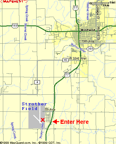 Strother Field is between Winfield and Arkansas City on US 77. A quick and easy route from Wichita is to go south on I-135 to US 160, east on US 160 to US 177, then south on US 77 to Strother Field. There are two entrances to Strother Field, take the South entrance and go west to the taxiway. For a closer look, check the detail map below.